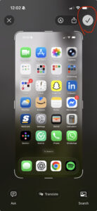 You’ll notice the screen flash white (like a quick camera snap), and you might hear a shutter sound (though it’s okay if you don’t, it likely just means your volume is on silent). AÂ picture of your screenshot will now appear in the middle of your screen. Here, you can save the screenshot by tapping the checkmark (circled in red in the photo below) and pressing “Save to Photos”.