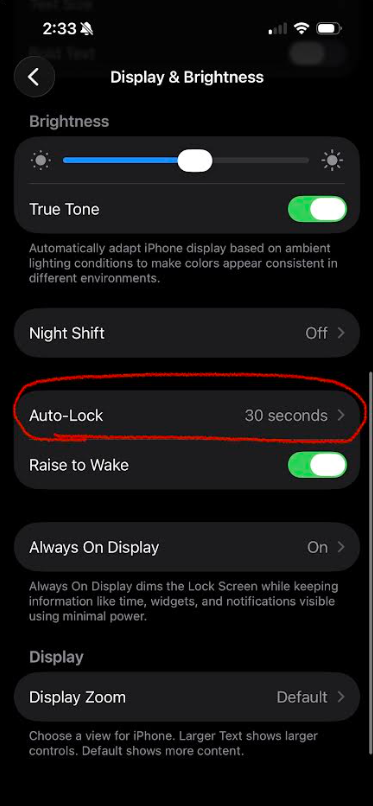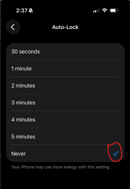 If you've ever turned on Low Power Mode, you may notice your screen goes dark faster than usual even after changing these settings. That's because Low Power Mode automatically sets Auto-Lock to 30 seconds to save battery. If you want your screen to stay on longer, make sure Low Power Mode is turned off first.